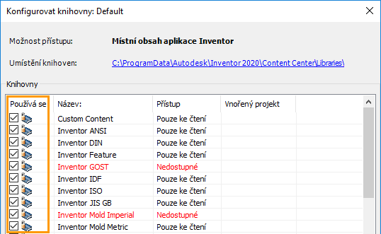 Soubory Obsahového centra nejsou v aplikaci Inventor k dispozici.