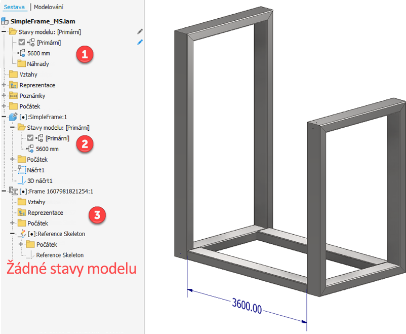 Systémem generovaná sestava rámové konstrukce Frame 160798... (3) se k řízení aktuálního rozvržení používá náčrt s názvem Referenční kostra. Referenční kostra je kopie geometrie náčrtu v prvku SimpleFrame. Vzhledem k tomu, že stavy modelu nejsou v souboru rámové konstrukce Frame vygenerované systémem povoleny, bude náčrt referenční kostry rámové konstrukce vždy odrážet kóty určené v náčrtu aktuálně aktivního stavu modelu prvku SimpleFrame:1.