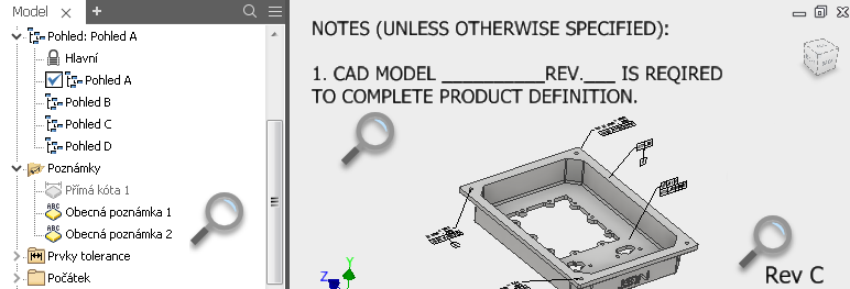 Seznam reprezentací zobrazení návrhu v prohlížeči modelu určuje pořadí pohledů modelu ve výstupním souboru 3D PDF. Chcete-li změnit umístění zobrazení návrhu, v prohlížeči přetáhněte zobrazení návrhu do požadovaného umístění v seznamu.