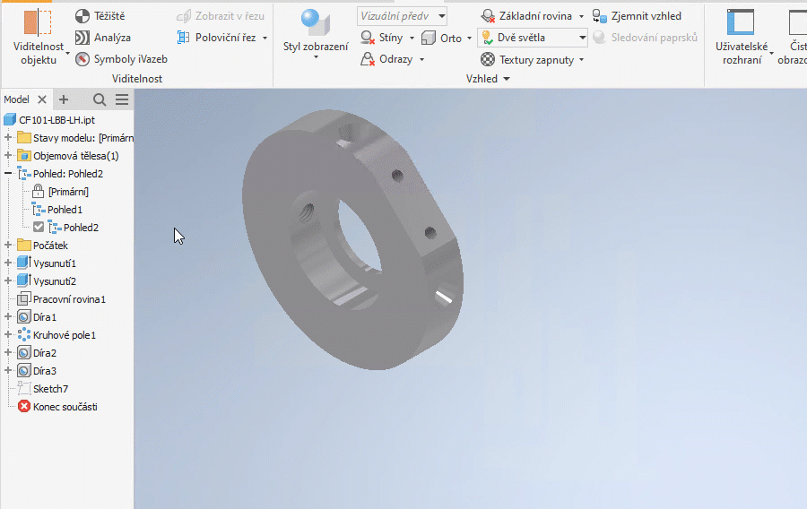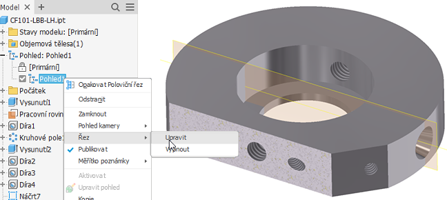 Proveďte řez modelem, aby se zobrazil průřezový nebo vnitřní pohled bez úpravy geometrie. Použití se součástmi nebo sestavami
