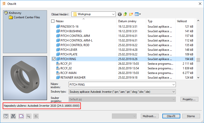 Vyhledejte a vyberte novější soubor součásti (IPT), který chcete umístit. Zobrazí se verze aplikace Inventor, ve které byl soubor naposledy uložen.