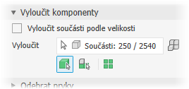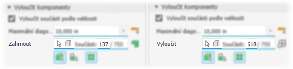 Vyloučit součásti podle výběru (výchozí). Možnost Vyloučit součásti podle velikosti není vybrána a je aktivní nástroj pro výběr vyloučených položek.
