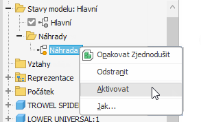 Náhrady jsou stavy modelu založené na zjednodušeném modelu. Jsou přidány do sestavy a umístěny ve složce Stavy modelu > Náhrady. Úprava zjednodušené náhrady: