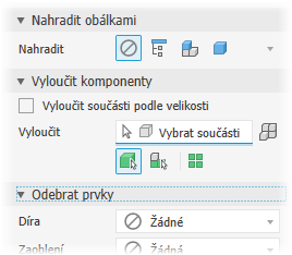 Vyloučit komponenty – poskytuje nástroje k výběru komponent, které chcete zahrnout do zjednodušené součásti nebo je z ní vyloučit. Vyberte jednotlivé komponenty nebo všechny výskyty komponenty.