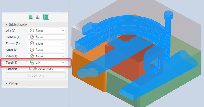 Možnost Odebrat prvky poskytuje možnosti výběru prvků, které chcete zahrnout do zjednodušené součásti nebo je z ní vyloučit, podle typu nebo velikosti. Seznam prvků zahrnuje díry, zaoblení, zkosení, kapsy (odebírání), reliéfy (přidávání) a tunely (jeden nebo více vstupů). Vnitřní prázdna jsou automaticky odebrána.