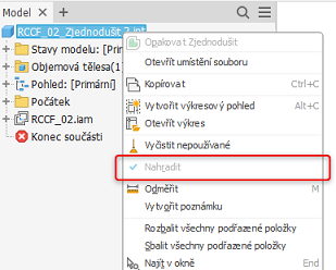 Kdykoli je součást nebo sestava vytvořena jako náhradní komponenta, zobrazí se v místní nabídce dané komponenty stav s názvem Náhrada určený pouze ke čtení. Když je zaškrtnuta možnost Náhrada, je součást či sestava náhradním modelem. Proto mají všechny soubory součástí stav Náhrada. Je zaškrtnuto POUZE tehdy, když byla komponenta vytvořena jako náhradní komponenta.