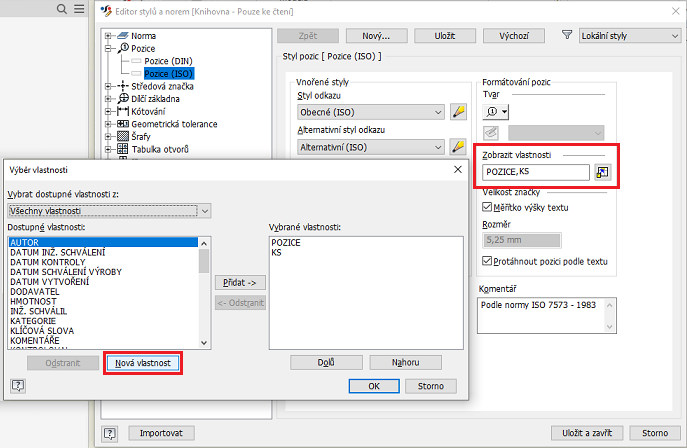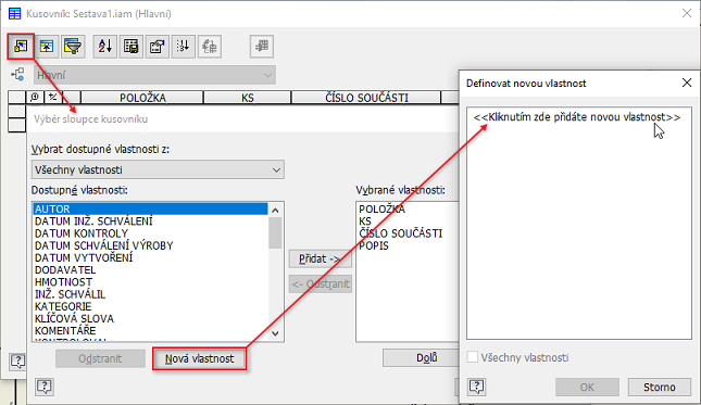 V dialogu Výběr sloupce kusovníku klikněte na tlačítko Nová vlastnost.