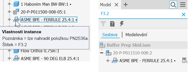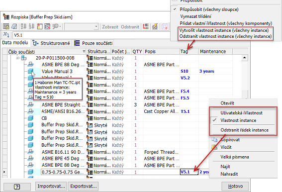 Na kartě Data modelu v dialogu Rozpiska se vždy zobrazují všechny řádky, které obsahují vlastnosti instance. Chcete-li zobrazit řádky instancí na kartách Strukturované nebo Pouze součásti, zrušte zaškrtnutí možnosti Sloučit řádky instancí v dialogu Nastavení sloučení řádků čísla součásti. Pole s ikonou řádku vlastnosti instance má modrozelené pozadí. Hodnoty vlastností instance jsou modré. Přesunutím kurzoru nad ikonu komponenty zobrazíte místní nápovědu. V té se zobrazují přiřazené vlastnosti instance.