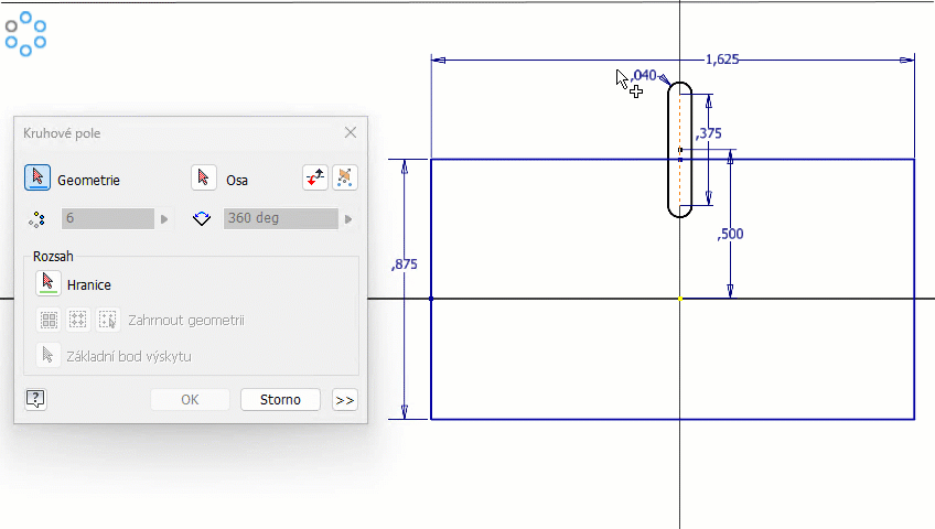 V dialogu Kruhové pole klikněte na selektor Osa a poté vyberte bod, vrchol nebo pracovní osu, která bude definována jako osa pole. Osa je na kreslicí ploše vyznačena šipkou.