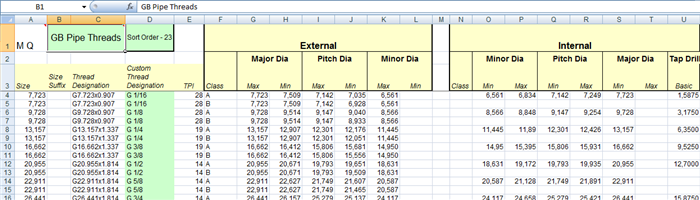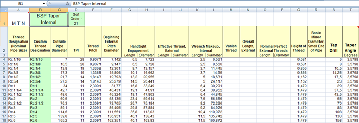 Tabulka Thread.xls obsahuje různé pracovní listy ve dvou formátech: Paralelní typ závitu nebo Zúžený typ závitu. Pracovní listy obsahují běžné průmyslové typy normalizovaných závitů a normalizované velikosti závitových dír. Můžete upravit listy pro: