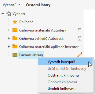 V podokně vlevo dole klikněte pravým tlačítkem na novou knihovnu a poté klikněte na možnost Vytvořit kategorii a novou kategorii pojmenujte.
