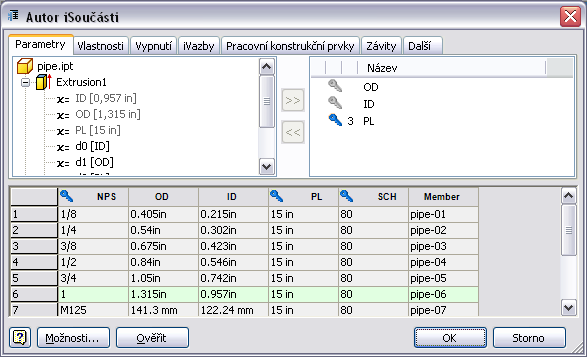 Zeleně zvýrazněný řádek je předvolený řádek. Chcete-li předvolený řádek změnit, pravým tlačítkem klikněte na příslušné číslo řádku, například 1/2, a vyberte možnost Nastavit jako předvolený řádek. Klikněte na tlačítko OK a součást potrubí v grafickém okně se automaticky aktualizuje.