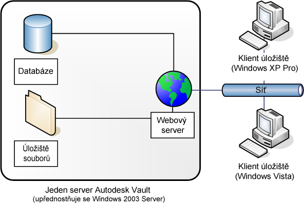 Aplikaci Autodesk Vault Basic ve sdíleném prostředí tvoří dvě komponenty – server úložiště a klientské aplikace úložiště. Na serveru jsou uloženy soubory hlavních dat se všemi informacemi o návrzích. Klientské aplikace umožňují přístup k souborům uloženým na serveru.