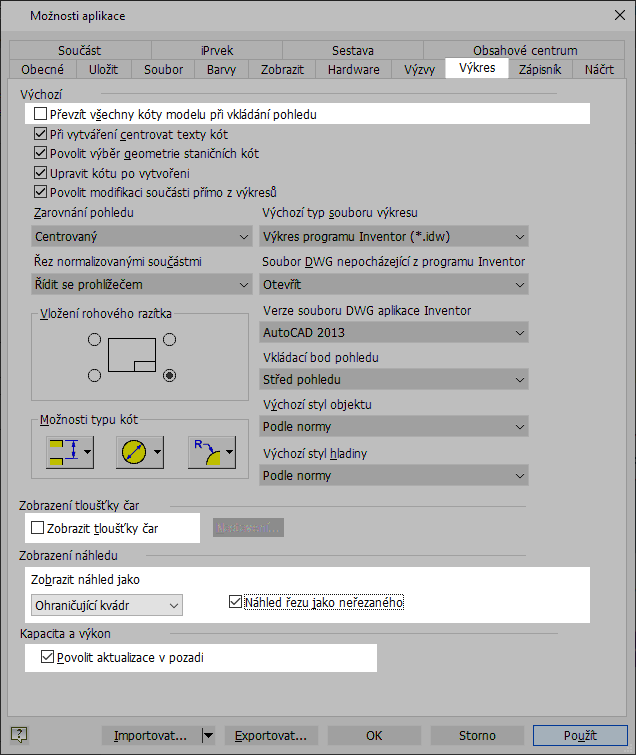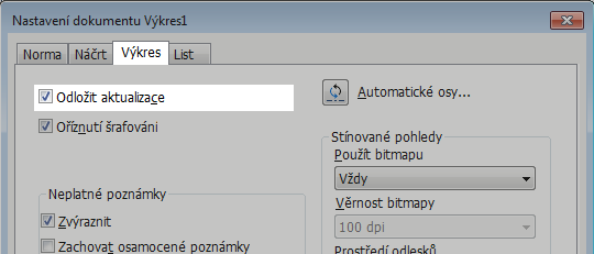 Také můžete nastavit, aby byl otevřený výkres ve stavu odložení aktualizací. Na pásu karet klikněte na kartu Nástroje a na panelu Možnosti klikněte na položku Nastavení dokumentu. V dialogu klikněte na kartu Výkres a zaškrtněte políčko vedle možnosti Odložit aktualizace. Dokud toto nastavení nebude vypnuto nebo přepsáno při otevření výkresu, nebudou se pohledy se změnami modelu aktualizovat.