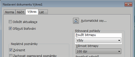 U šablon výkresů určete pro stínované pohledy použití bitmap během operací zobrazení, což je lepší řešení než výběr možnosti Pouze offline. Provedete to tak, že otevřete šablonu výkresu Norma.idw a uložíte ji jako „Norma velké sestavy.idw“. Na kartě Nástroje na panelu Možnosti klikněte na položku Nastavení dokumentu. Na kartě Výkres v části Stínované pohledy nastavte možnost Použít bitmapu na hodnotu Vždy. Uložte změny.