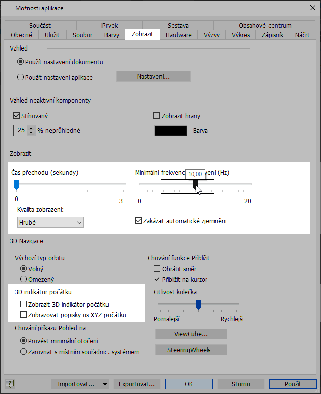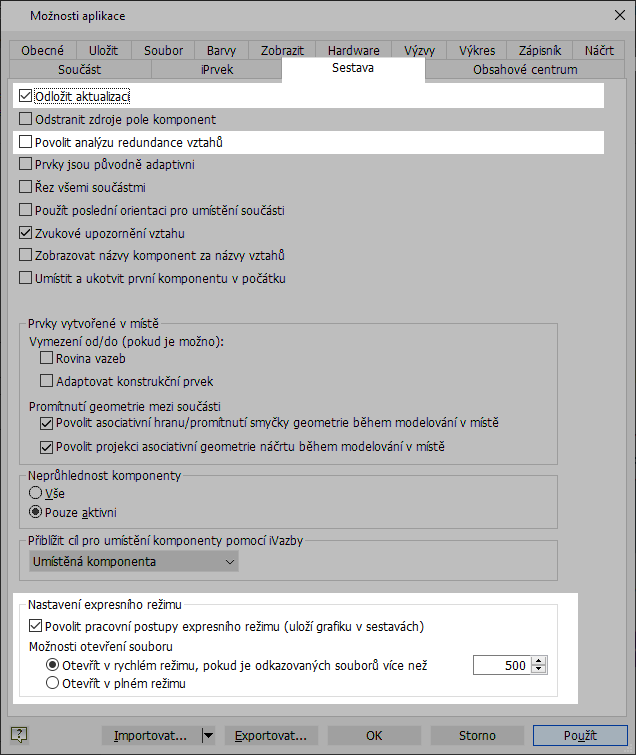 Následující možnosti aplikace ovlivňují výkon sestavy.