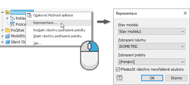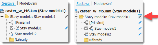 | Použito za účelem správy | Viditelnost a další atributy pohledu | Hodnota omezení, stav ukotvení, hodnoty polohového odsazení | Vypnutí prvků a komponent, zjednodušení sestavy (náhrady) | Vyloučení komponent, vypnutí prvků součásti (a další vlastnosti konfigurace) |