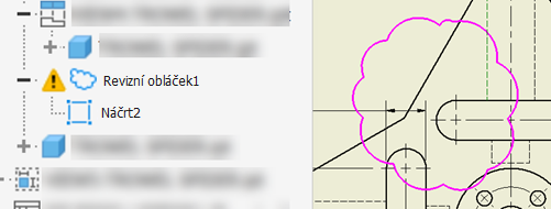 Podobně jako u ostatních poznámek výkresu platí, že pokud revizní obláček není uzavřený nebo je nesprávně definován, jeho barva na kreslicí ploše se změní na fialovou a u uzlu prohlížeče se zobrazí výstražný trojúhelník. To znamená, že je nutné provést opatření k vyřešení problému s obsahem náčrtu. Lze provést následující úkony: