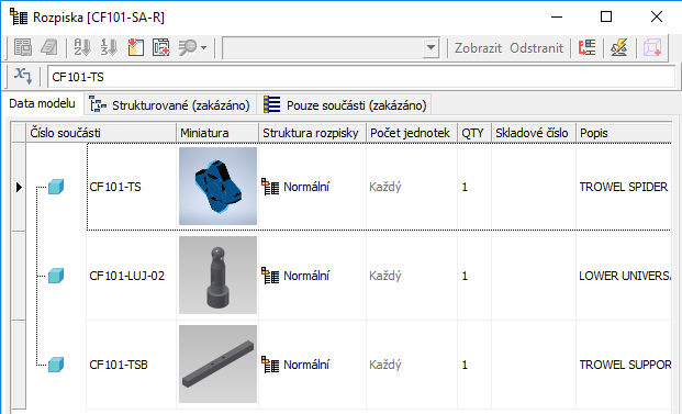 Rozpiska zobrazuje odkazované komponenty v sestavě.