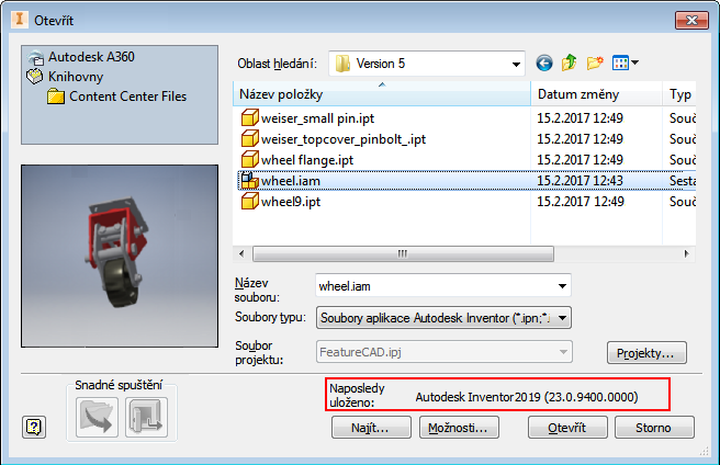 Soubor může být uložen a znovu otevřen v jakékoli instalaci aplikace Inventor stejné verze.