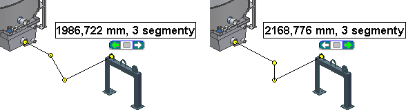 Když zvolíte platnou geometrii, například dva kruhové otvory, vrcholy a pracovní body, systém vytvoří nezbytné segmenty a body trasy. V závislosti na zvolených bodech může existovat jedno nebo více řešení trasy. V tomto případě se zobrazí funkce Zvolit jiné. Mezi řešeními lze při vytváření trasy nebo při dalších úpravách procházet a vybrat takové, které nejlépe vyhovuje požadavkům.