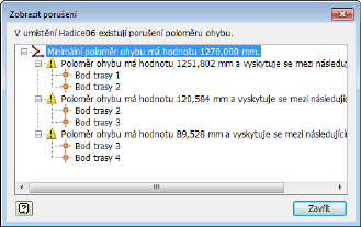 Pomocí možnosti Kontrola poloměru ohybu vyhledejte ohyby, které porušují určený minimální poloměr ohybu. Můžete spustit kontrolu poloměru ohybu na vybrané trase flexibilní hadice. V prohlížeči se zobrazí ikona podél trasy na které došlo k porušení.