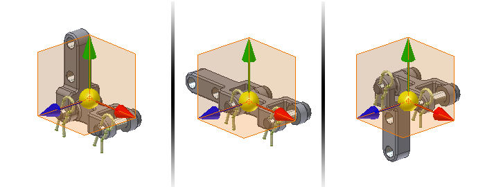 Koule v ose značky těžiště obsahuje vybíratelný pracovní bod. Pracovní bod uvnitř koule udává umístění těžiště pro vybranou sestavu, podsestavu nebo součást. Jsou také zobrazeny směrové šipky znázorňující osy X, Y a Z a vybíratelné pracovní roviny reprezentující roviny XY, XZ a YZ.
