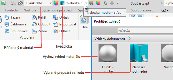 Poznámka: Materiály mají výchozí přiřazení vzhledů. Když vzhled přepíšete, přidá se před název v panelu nástrojů Rychlý přístup hvězdička. Je to proto, abyste věděli, který přiřazený vzhled není výchozím vzhledem.