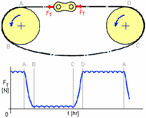 Řetězy v řetězových pohonech jsou zatěžovány cyklickým napětím, takže na řetěz působí únavový jev. Typické schéma zatížení je uvedeno na následujícím obrázku. U různého uspořádání pohonů se schéma zatížení může lišit.