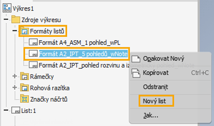 Formáty listů. Pravým tlačítkem klikněte na formát listu a vyberte možnost Nový list.