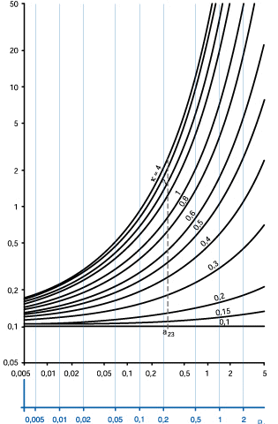 Pro κ > 4 použijte křivku pro κ = 4. Vzhledem k tomu, že hodnota η c (P u / P) se blíží nule, hodnota a SKF se blíží k 0.1 pro všechny hodnoty κ. Přerušovaná čára označuje polohu starého a 23 (κ) měřítka, kde a SKF = a 23.