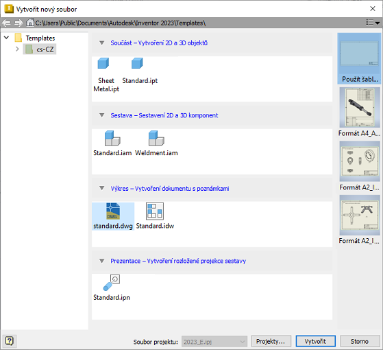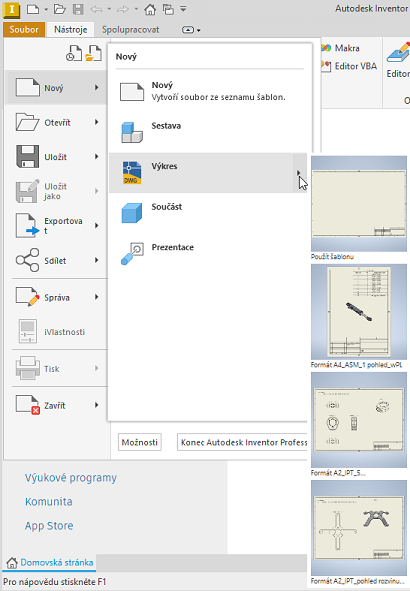 Na panelu Nový umístěte kurzor nad položku Výkres. Zobrazí se možnosti šablony a formátu listu.