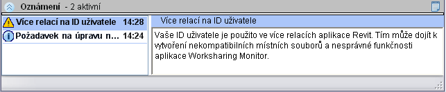 V aplikaci Worksharing Monitor vás aktivní oznámení informují o aktuálním problému, který ovlivňuje (nebo může ovlivňovat) práci v aplikaci Revit.