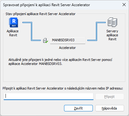 Následující postup použijte, pokud chcete zkontrolovat stav připojení k akcelerátoru, který byl přiřazen k vašemu umístění (jak je určeno proměnnou prostředí RSACCELERATOR2026 Release vašeho systému), a pokud je to nutné, určete jiný akcelerátor. Pokud ztratíte síťové připojení k akcelerátoru aplikace Revit Server nebo jej nechcete použít, budete připojeni přímo k serverům aplikace Revit Server.
