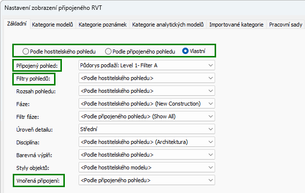 K ovládání použití filtrů připojených modelů v pohledu hostitele slouží nastavení v dialogu Nastavení zobrazení připojeného souboru RVT.