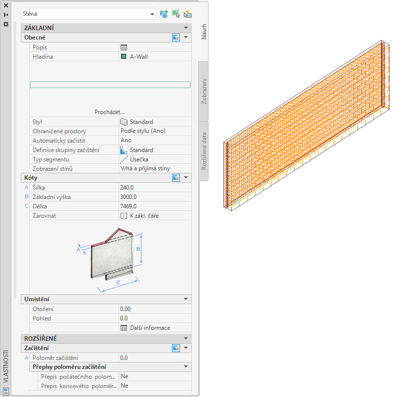 - Je-li to nutné, upravte kóty nové stěny, aby bylo dosaženo přesnější shody s importovanou stěnou.