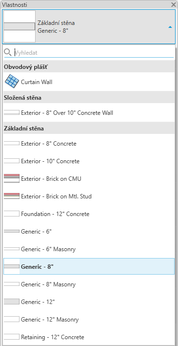 Nástroj Výběr typu identifikuje aktuálně vybraný typ rodiny a umožňuje vybrat v rozevíracím seznamu jiný typ.