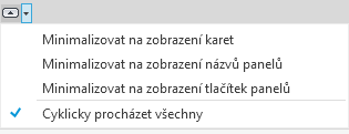 | Určení preferovaného způsobu minimalizace pásu karet | Napravo od karet na pásu karet klikněte na šipku směřující doprava a vyberte požadované chování: Minimalizovat na zobrazení karet, Minimalizovat na zobrazení názvů panelů, Minimalizovat na zobrazení tlačítek panelů nebo Cyklicky procházet všechny.