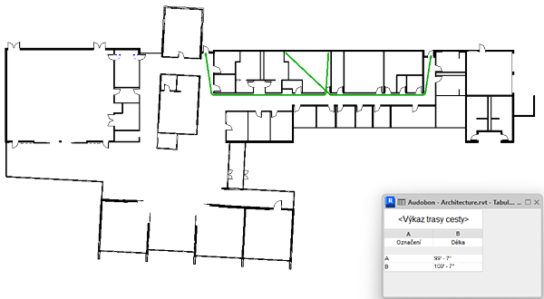 U většiny návrhů budete moci určit, které prostory je potřeba vyhodnotit pro maximální vzdálenosti pohybu. K vyhledání skutečné vzdálenosti pohybu použijte nástroje pro analýzu trasy. V ukázkovém videofilmu jsou do nejvzdálenějších rohů místnosti, která se nachází nejdále od východů, umístěny dvě čáry trasy cesty k východu. Ve výkazu se zobrazí délky čar trasy. Výkaz označuje cestu „A“ jako maximální vzdálenost k nejbližšímu východu.