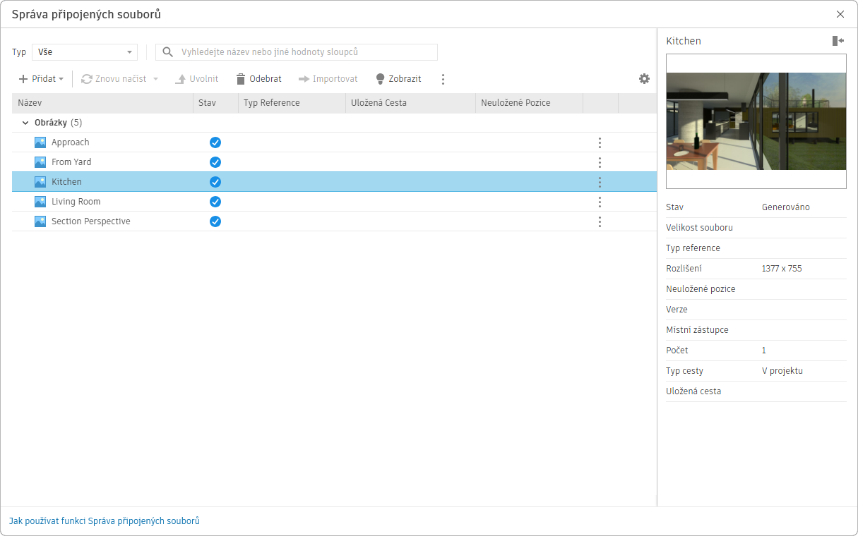 Pomocí nástroje Správa připojených souborů můžete také odeslat a nahradit existující připojené soubory a obrázky v projektu aplikace Revit. Změny, které provedete v nástroji Správa připojených souborů, aktualizují obrázky a soubory PDF v souborech aplikace Revit vašich kolegů.