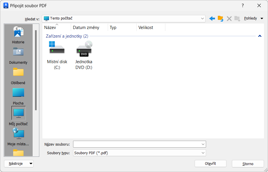 K nástrojům Připojit soubor PDF a Připojit obrázek můžete získat přístup na kartě Vložit na panelu nástrojů aplikace Revit. Po kliknutí na tlačítko Připojit soubor PDF nebo Připojit obrázek se zobrazí dialog, ve kterém můžete vybrat požadovaný obrázek nebo soubor PDF.