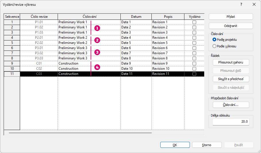 Naučte se, jak vytvářet a přiřazovat vlastní posloupnosti číslování revizí v projektech.