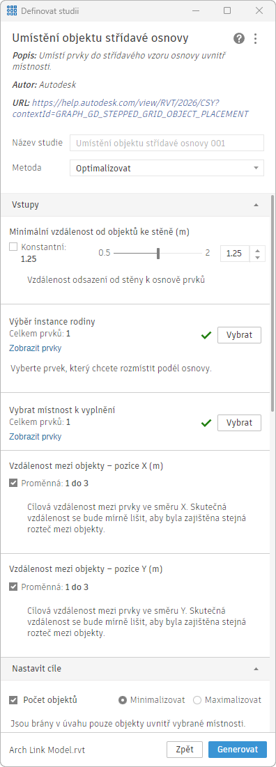 Pomocí možnosti Vytvořit studii vyberte typ studie a definujte cíle a kritéria studie. Potom kliknutím na tlačítko spustíte studii a vygenerujete alternativy návrhu. Během procesu generování můžete pokračovat v práci na modelu.