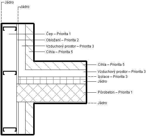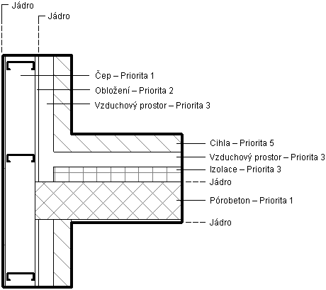 Následující obrázek znázorňuje, jak se vrstvy s vyšší prioritou spojují dříve než vrstvy s nižší prioritou. Vrstva pórobetonu s prioritou 1 u horizontální stěny prochází skrze všechny vrstvy, dokud nedosáhne vrstvu sloupku s prioritou 1 u vertikální stěny. Všimněte si, že izolace v horizontální stěně neprochází skrze vzduchovou mezeru ve vertikální stěně, protože obě tyto vrstvy mají prioritu 3 a jsou mimo vrstvu nosné části.