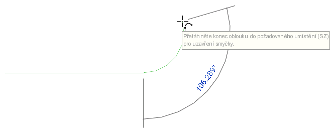 Oblouk počátek-konec-poloměr se zadá nakreslením tětivy, která připojuje 2 konce oblouku, a poté se zadá úhel nebo poloměr se třetím bodem.