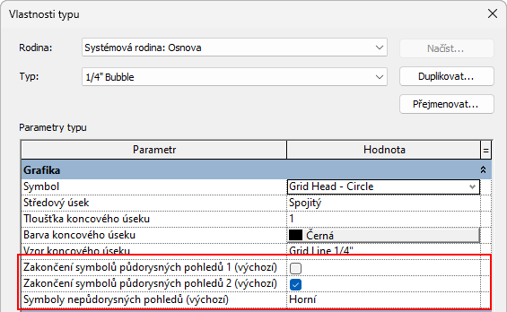 - Chcete-li zobrazit bubliny osnovy v koncovém bodu čar osnovy v půdorysném pohledu, vyberte položku Symboly půdorysného pohledu – konec 2.