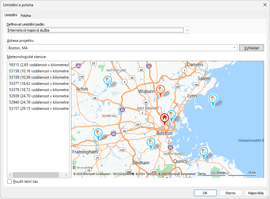 Před provedením energetické optimalizace modelu budovy určete její geografické umístění a vyberte nejbližší meteorologickou stanici.