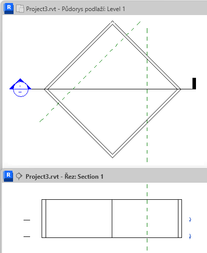 Například v následujícím půdorysu podlaží jsou zobrazeny dvě referenční roviny vyznačené zelenými čárkovanými čarami. Referenční rovina vlevo se protíná s čárou řezu v určitém úhlu. Referenční rovina vpravo je kolmá na čáru řezu. Protože šikmá referenční rovina není kolmá na čáru řezu, ve výsledném pohledu řezu nebude tato rovina zobrazena. Kolmá referenční rovina však v pohledu řezu zobrazena bude.