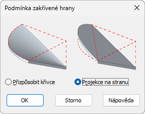 Nástroj Podmínka zakřivené hrany je další nástroj specifický pro zakřivené hrany. Nastaví, že se bude rovný povrch promítat na hranu zakřiveného povrchu, který se podřídí hraně oblouku prvku.