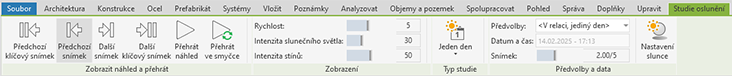 Typ studie: Změňte typ studie oslunění. K dispozici jsou možnosti Statický obrázek, Jednotlivý den, Ve více dnech a Osvětlení.